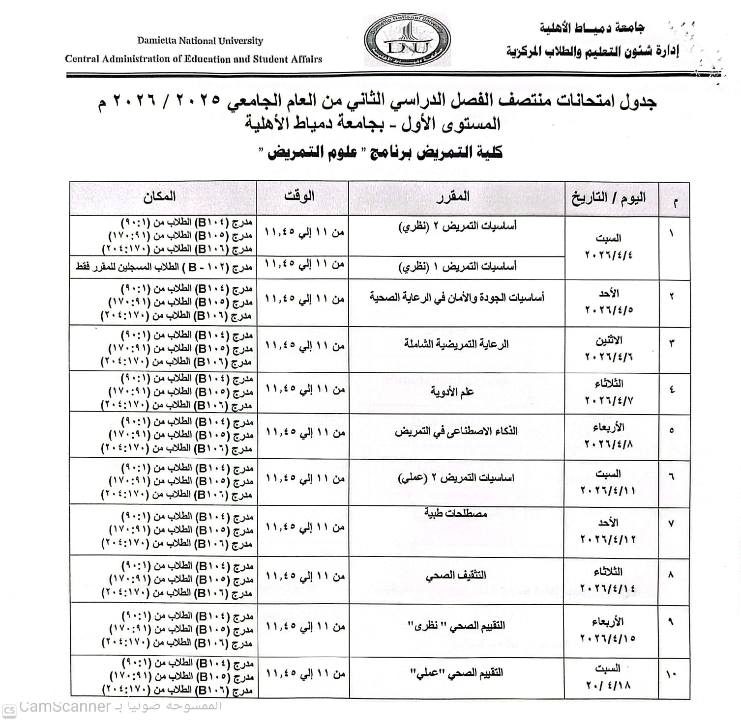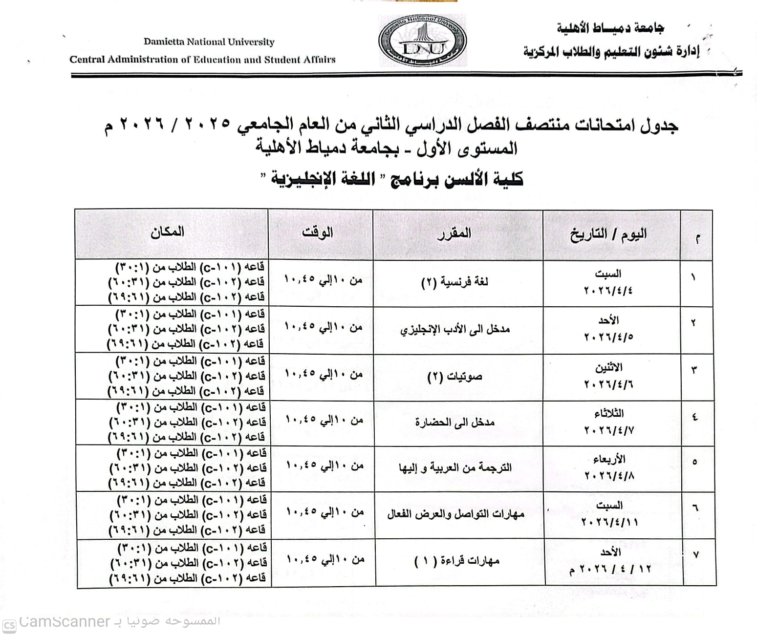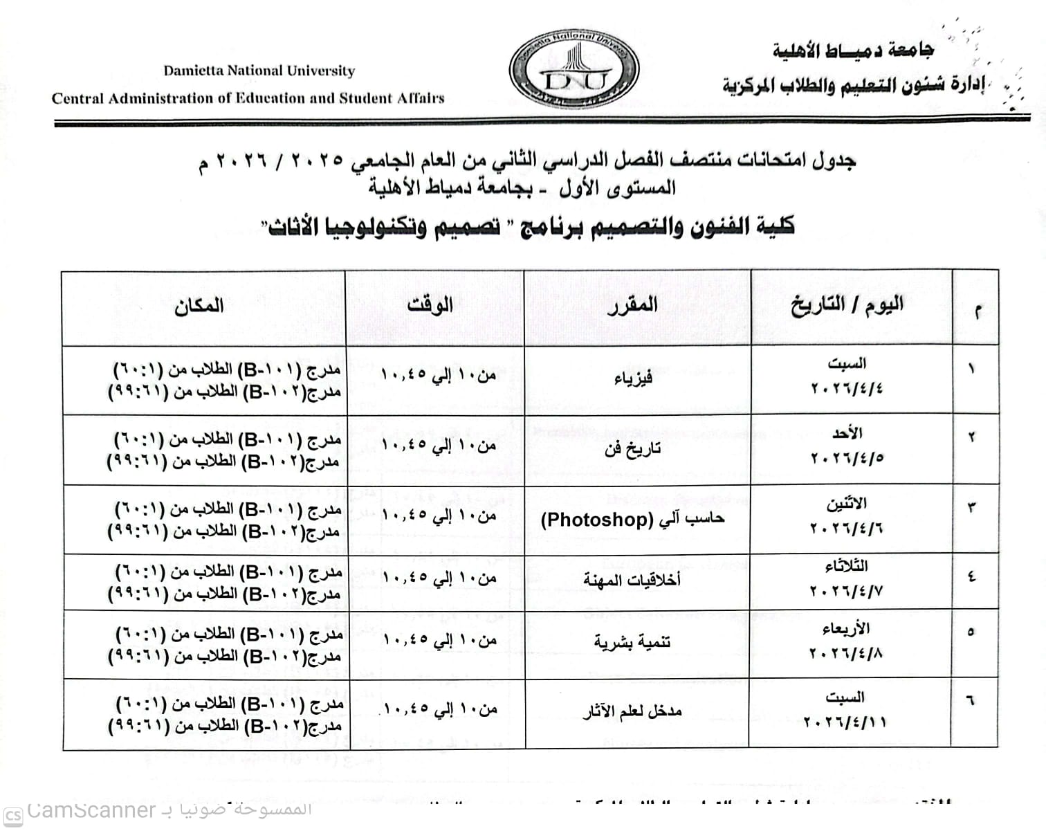 تعلن إدارة جامعة دمياط الأهلية عن الجداول الدراسية لامتحانات منتصف الفصل الدراسي الثاني للعام الجامعي ٢٠٢٦/٢٠٢٥