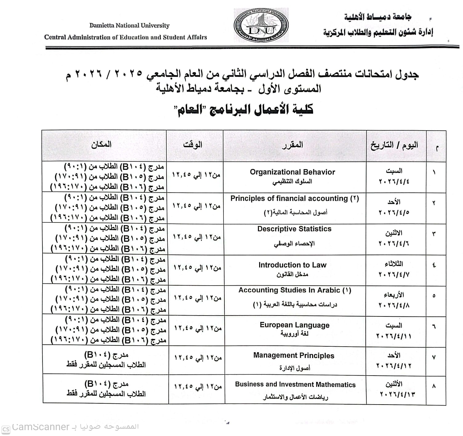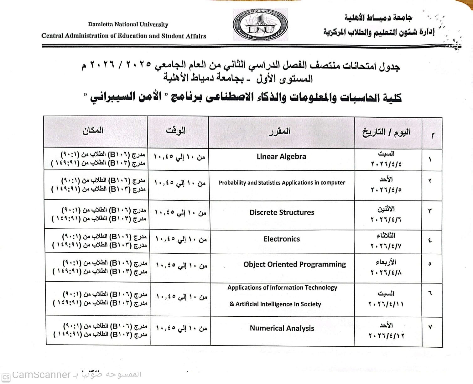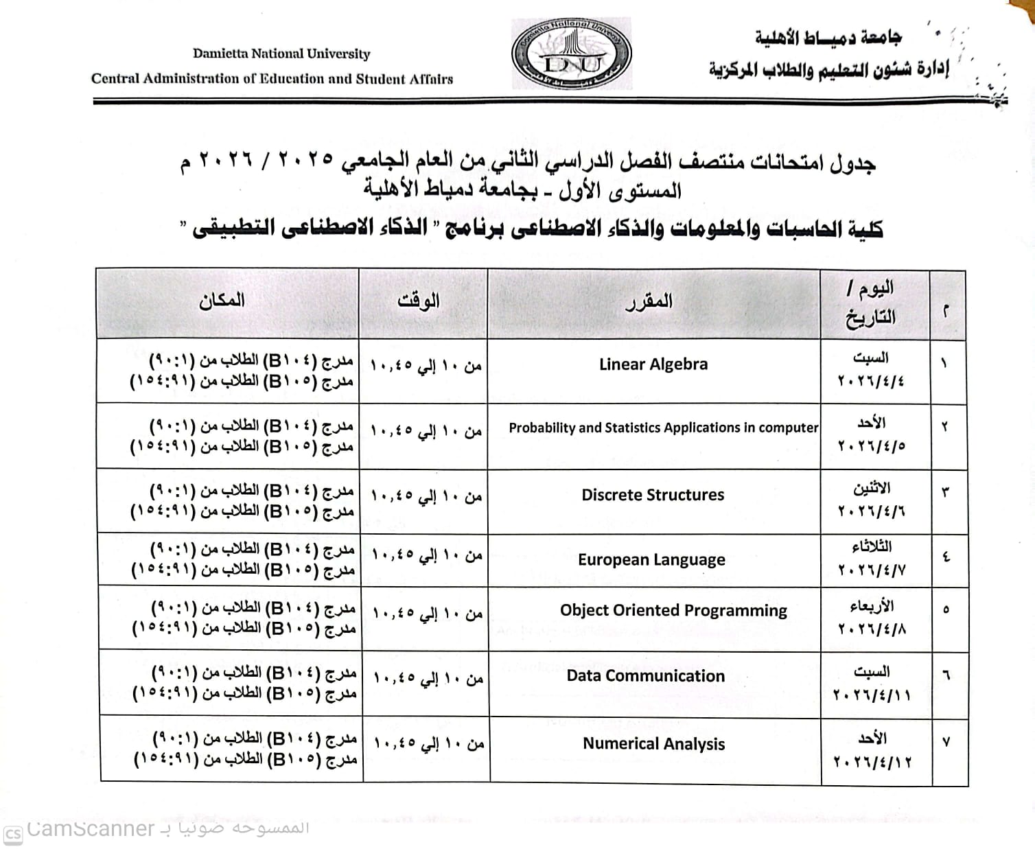 تعلن إدارة جامعة دمياط الأهلية عن الجداول الدراسية لامتحانات منتصف الفصل الدراسي الثاني للعام الجامعي ٢٠٢٦/٢٠٢٥