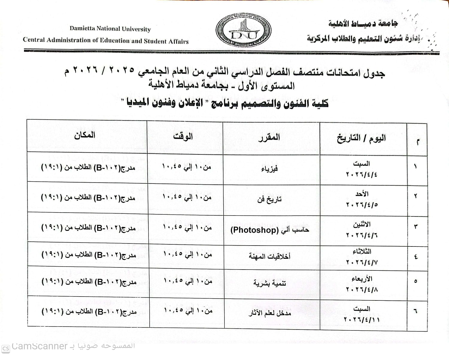 جامعة دمياط الأهلية تعلن جداول امتحانات منتصف الفصل الدراسي الثاني لطلاب المستوى الأول بكليات الجامعة للعام الجامعي ٢٠٢٦/٢٠٢٥